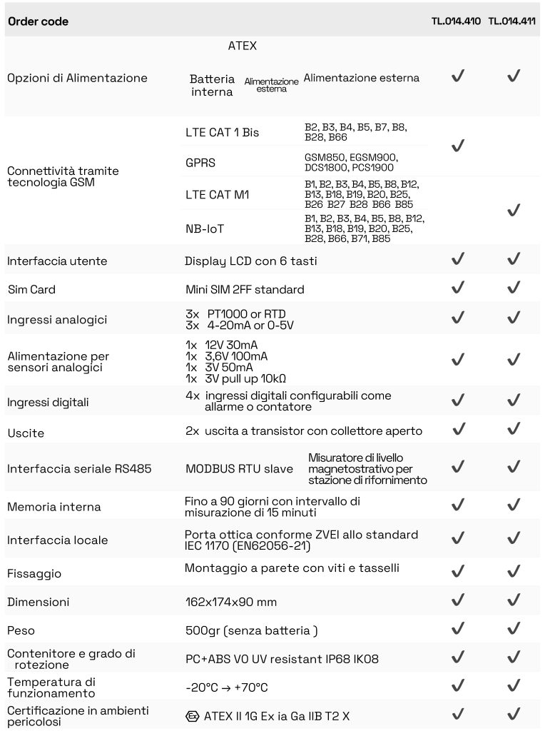 Il dispositivo è dotato di ingressi digitali e analogici configurabili, che consentono il controllo e la misurazione di diverse grandezze fisiche: livello, pressione, temperatura, peso o soglie, oltre ad allarmi per contatori digitali e/o impulsi.